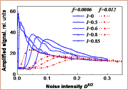 Експериментально показано, що при неоптимальній інтенсивності шумового потоку, яка недостатня для реалізації стохастичного резонансу (СР), можна керувати середньою частотою переходів кільця між його метастабільними станами і тим самим підсиленням слабкого сигналу, отримуючи максимально можливе підсилення за допомогою додаткового детермінованого змінного магнітного потоку з частотою, що значно перевищує частоту підсилюваного корисного сигналу. Частотні характеристики посилення композитного багаточастотного сигналу в режимах керованого стохастичного підсилення та «чистого» СР відрізняються один від одного [10].