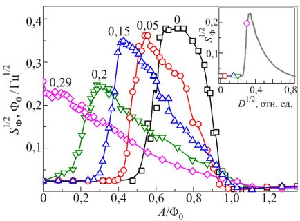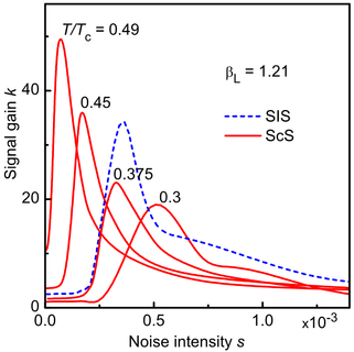 Чисельне вирішення рівнянь Ланжевена для одноконтактного надпровідного квантового інтерферометра показує, що кооперативна дія шуму і періодичного високочастотного електромагнітного поля приводить до посилення слабкого гармонійного сигналу завдяки механізму стохастично-детерміністичного резонансу, який схожий на звичайний ефект стохастичного резонансу. Цей новий ефект, який ми назвали стохастично-параметричним резонансом (СПР) дає можливість отримувати максимальне посилення при довільно малому рівні шуму. [16]