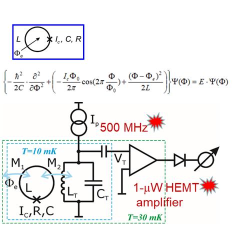 Принцип дії запропонованого нами лічильника поодиноких фотонів [1, 2] – використання переходів між дискретними квантовими станами потокового кубіту (які ми розраховували чисельно з рівняння Шредінгера у [1]) після резонансного поглинання їм НВЧ, або мікрохвильового, (~10 ГГц) фотону, в результаті чого змінюється магнітний потік у кільці кубіту. Ця невелика зміна (~0.3 F0, кванту магнітного потоку) фіксується слабо пов’язаним з ним ВЧ НКВІДом, який працює у безгістерезисному режимі [3] на частоті накачування, що підвищена на порядок (до 500 МГц) порівняно з традиційними конструкціями для зменшення ефекту так званої «зворотної дії». (Зворотна дія викликає декогерецію кубіта, тобто порушення його квантових станів.)